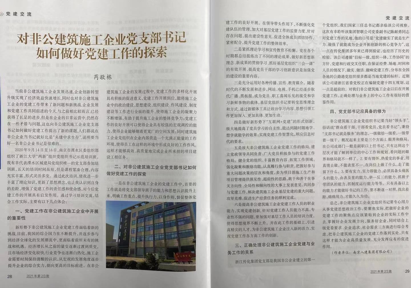 芮敬棟所寫《 對非公建筑施工企業(yè)黨支部書記 如何做好黨建工作的探索》刊登在2021.2/3《江蘇建筑業(yè)》上 -