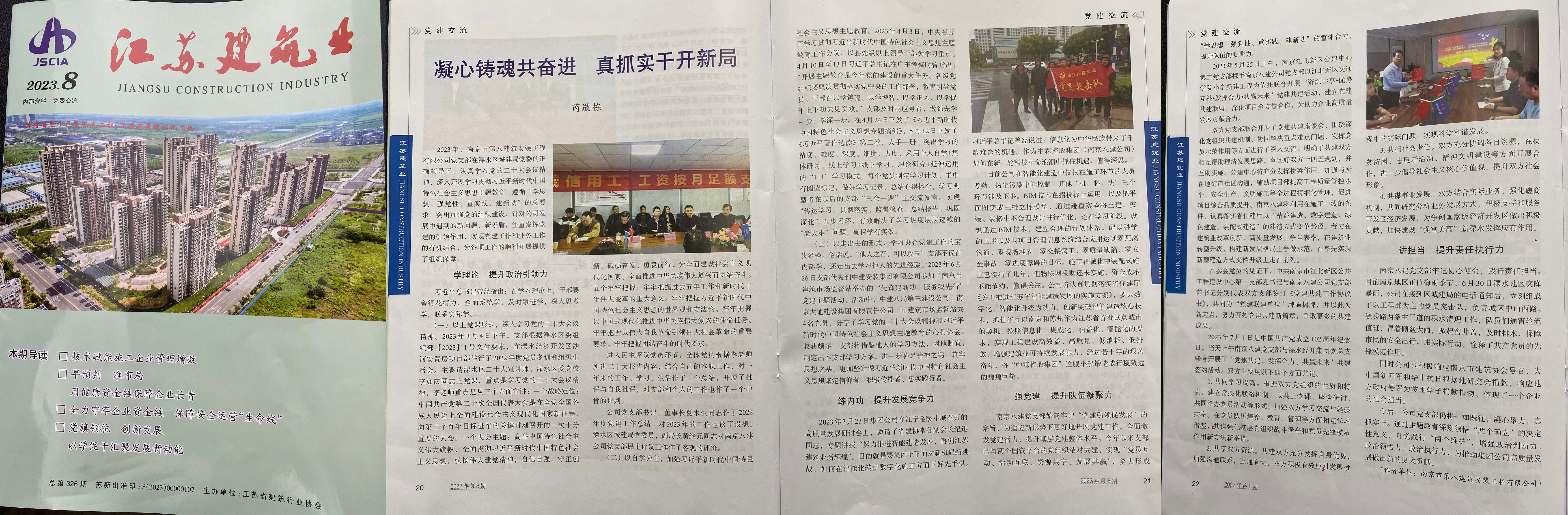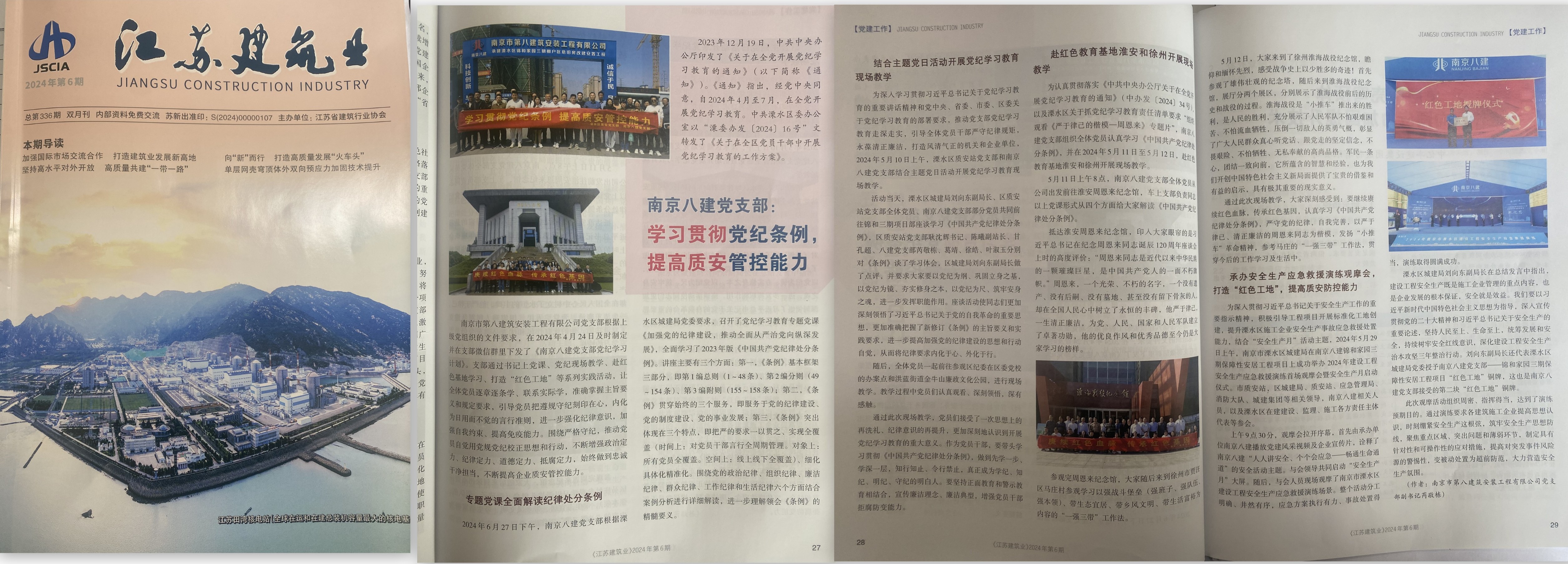 2024年6月,江蘇建筑業(yè)協(xié)會主辦的《江蘇建筑業(yè)》(2024年第6期)刊登了芮敬棟同志《南京八建黨支部:學(xué)習(xí)貫徹黨紀(jì)條例,提高質(zhì)安管控能力》一文 -